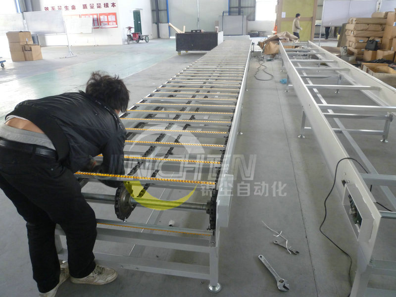 鏈條線是在承載的鏈條上,每節(jié)之間再加上一個(gè)較高的承載滾子附件來承載貨物。而鏈條是以滾子來與軌道滾動(dòng)滑行。由于鏈條上的滾子與軌道是以滾動(dòng)接觸,摩擦阻力小,動(dòng)力損耗低且可承載較重的荷重。其荷重能力與支架強(qiáng)度、鏈條大小及滾子尺寸、材質(zhì)均有關(guān)系,滾子材質(zhì)通常為鋼制,但有些場合為了降低噪音,而采用耐磨耗的工程塑料制造。